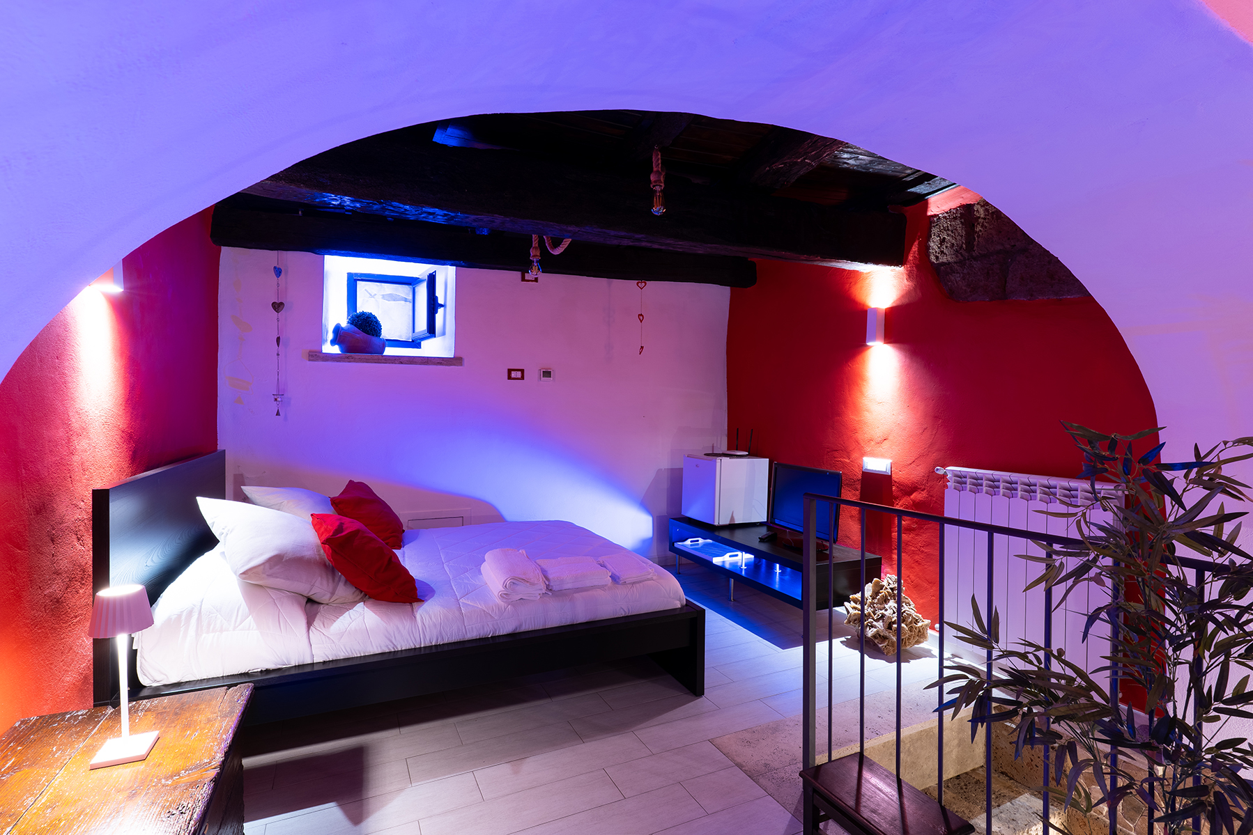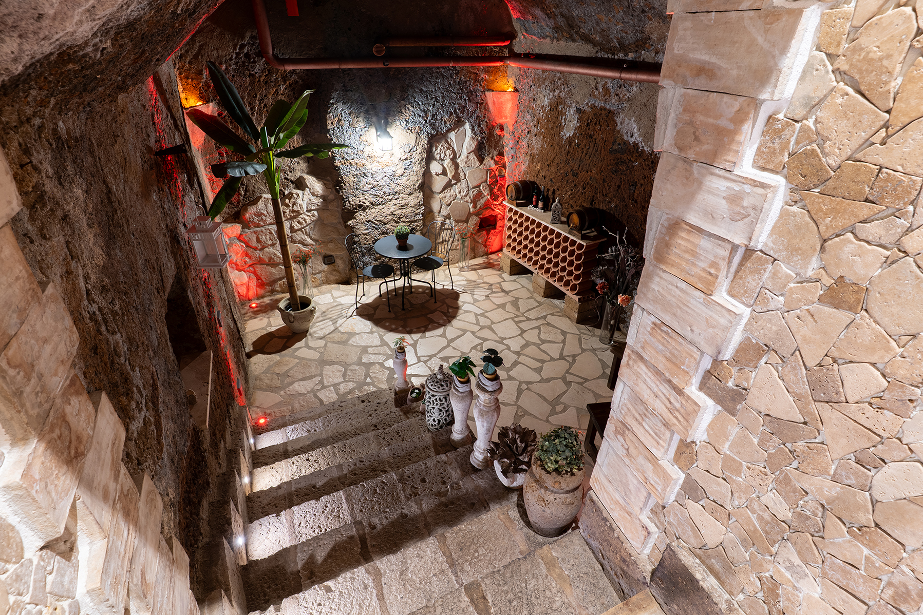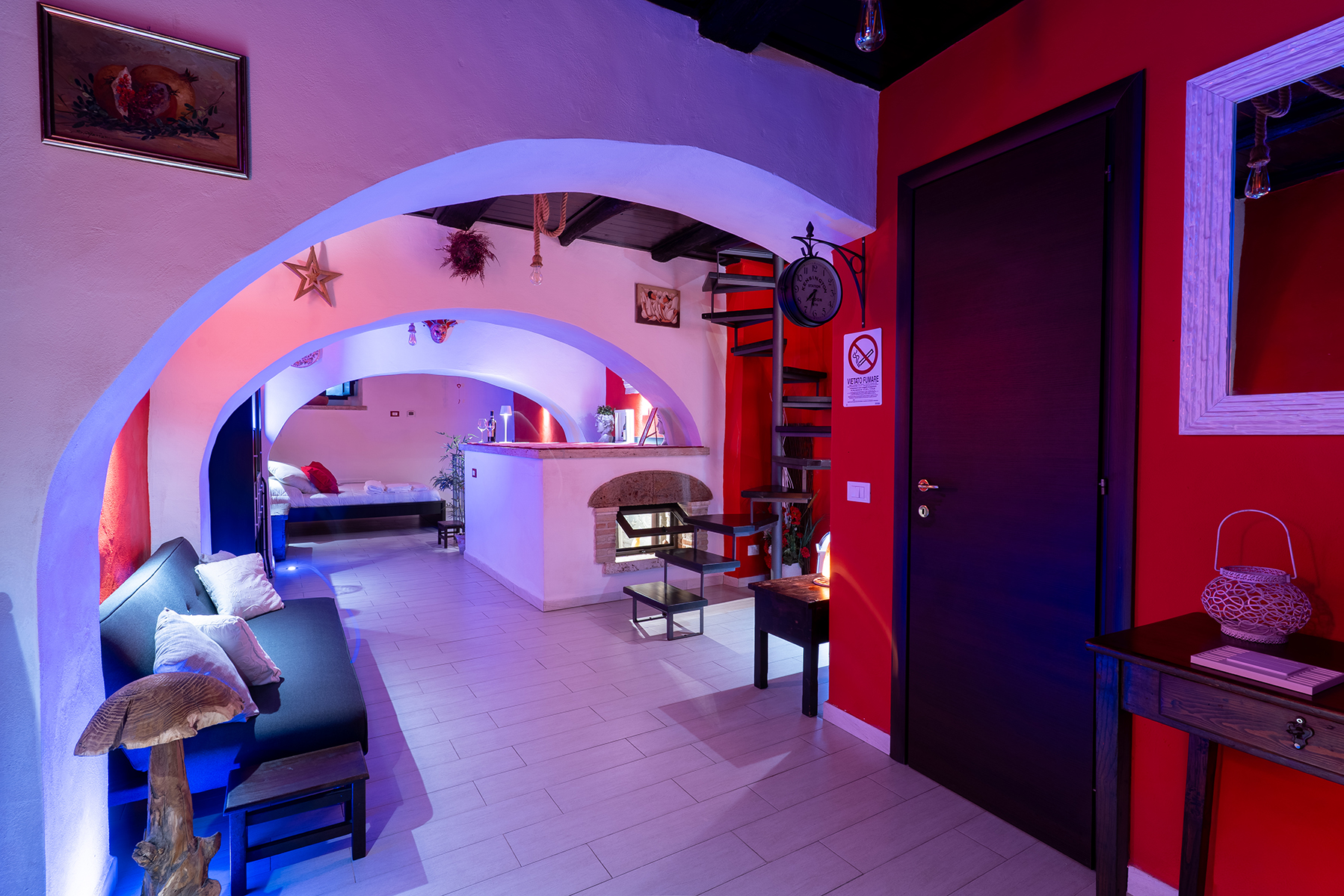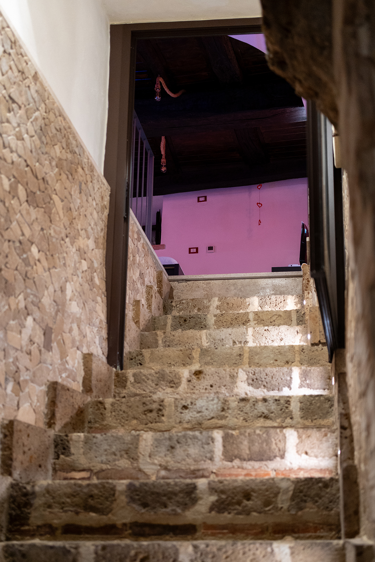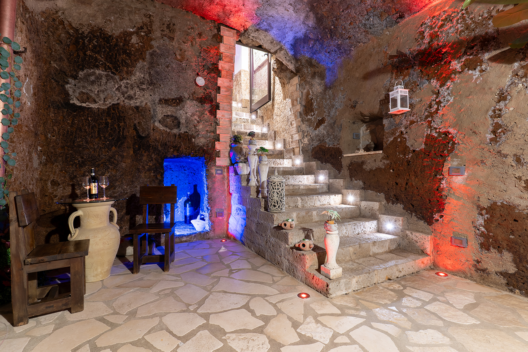L’appartamento Le Segrete del Sangallo accoglie gli ospiti in un ambiente unico, caratterizzato da soffitti in legno, archi e pareti in tufo, arricchito da luci emozionali che creano atmosfere calde e rilassanti. Scendendo al piano interrato, una suggestiva cantina scolpita nel tufo invita a vivere un’esperienza sensoriale tra storia e gusto, ideale per momenti di degustazione e relax.