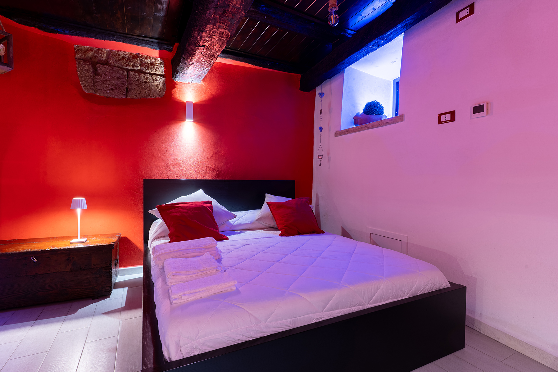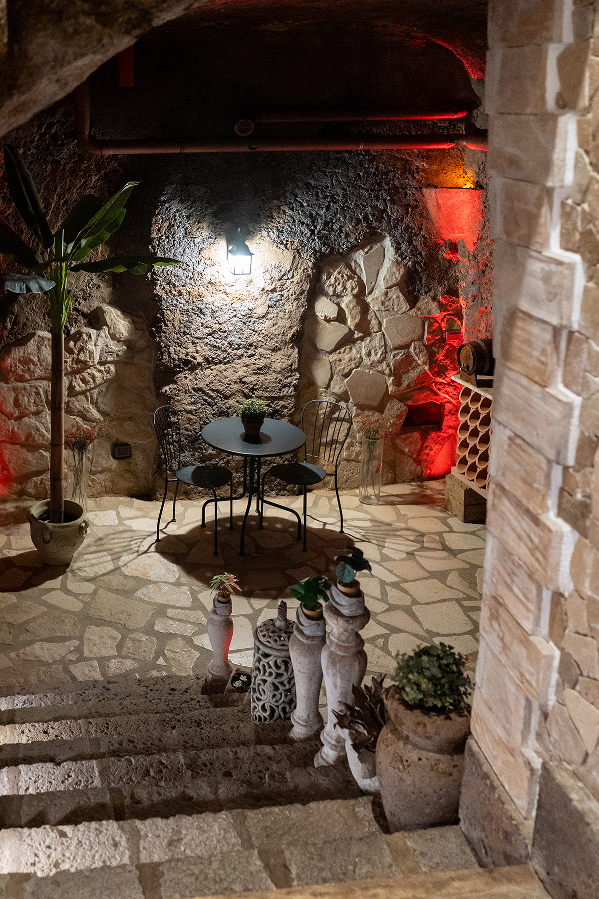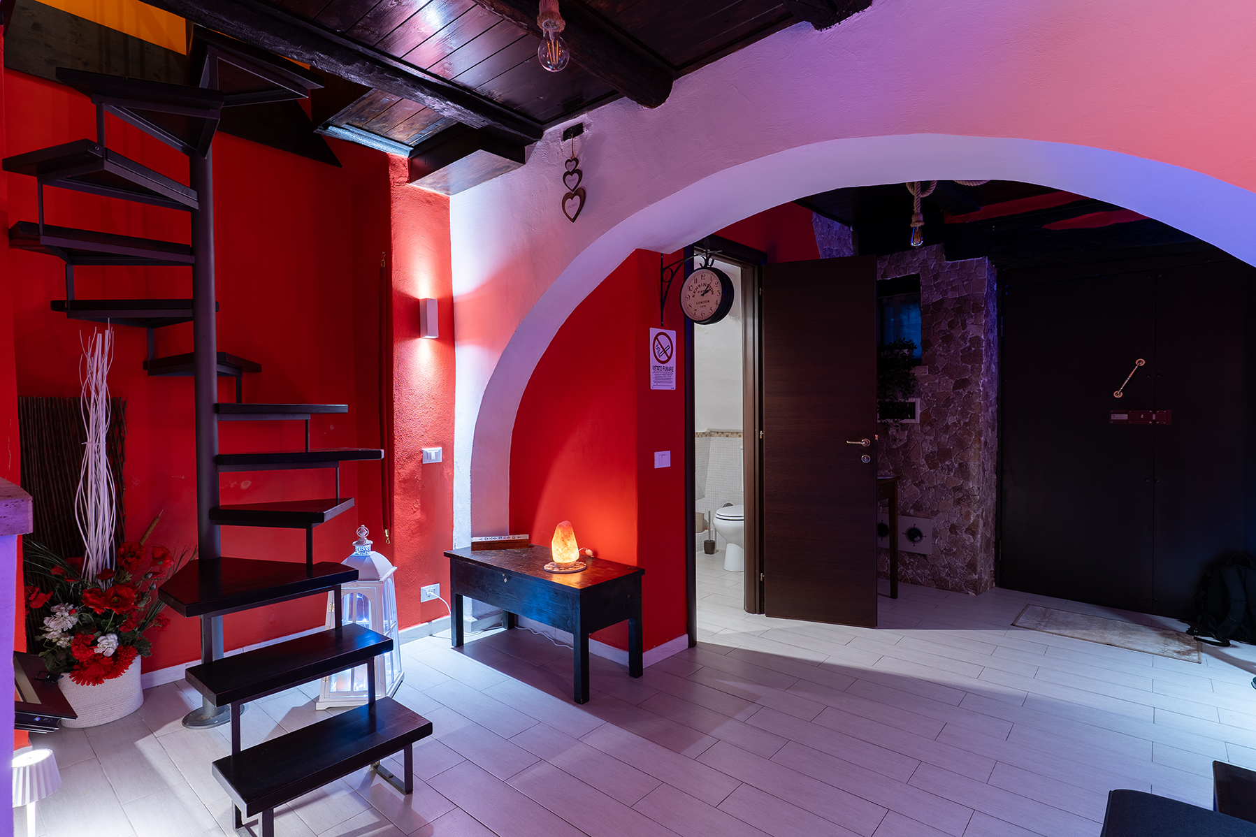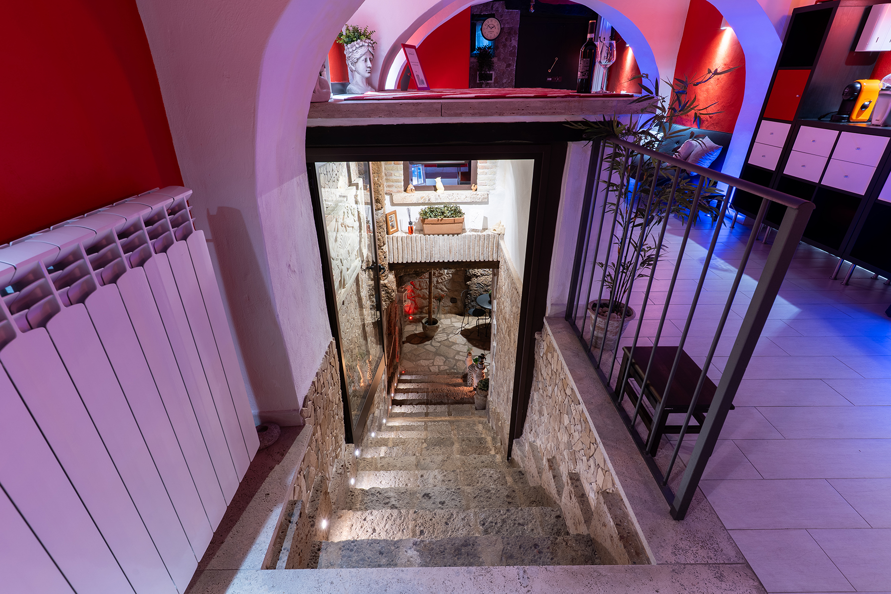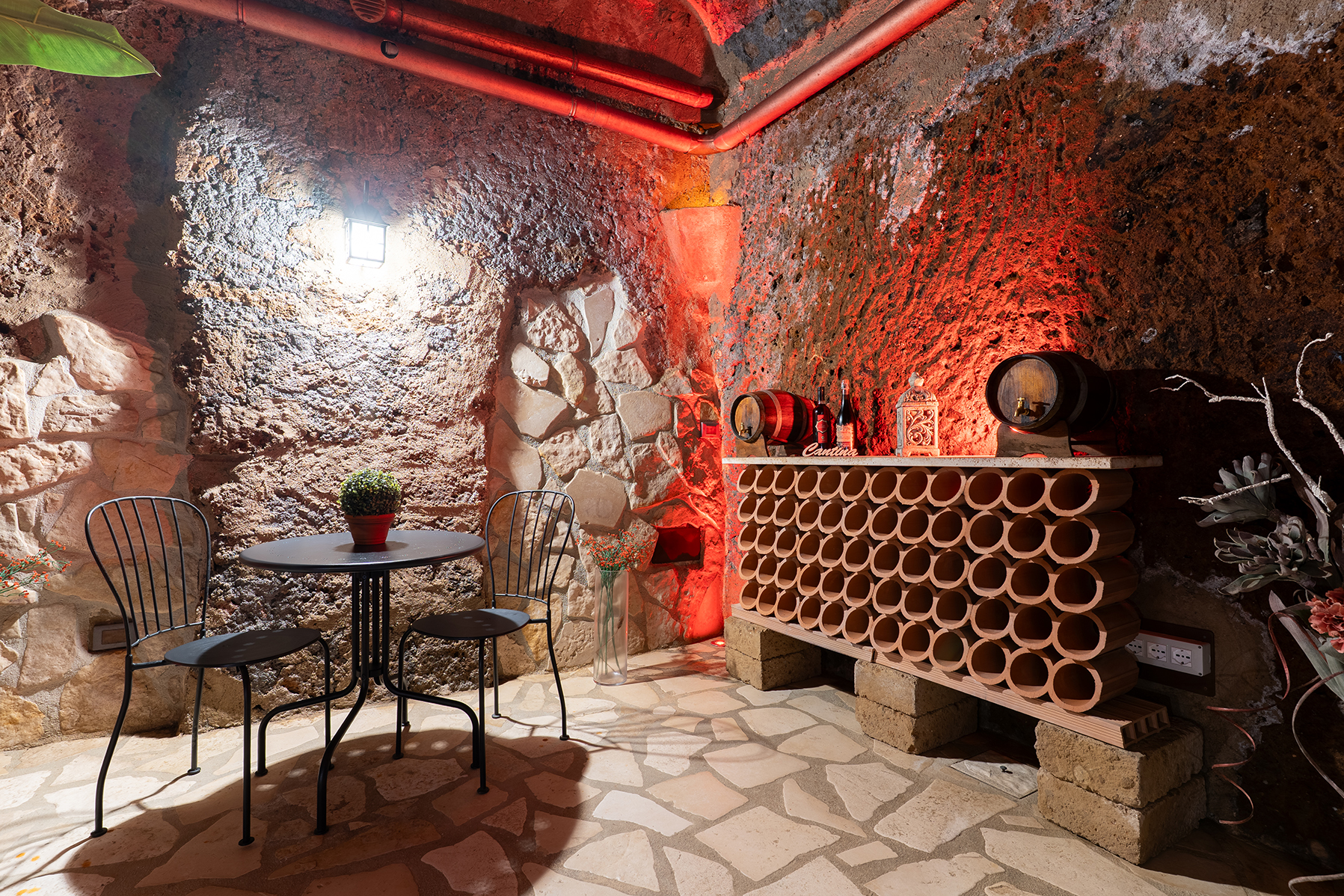 L’appartamento Le Segrete del Sangallo accoglie gli ospiti in un ambiente unico, caratterizzato da soffitti in legno, archi e pareti in tufo, arricchito da luci emozionali che creano atmosfere calde e rilassanti. Scendendo al piano interrato, una suggestiva cantina scolpita nel tufo invita a vivere un’esperienza sensoriale tra storia e gusto, ideale per momenti di degustazione e relax.