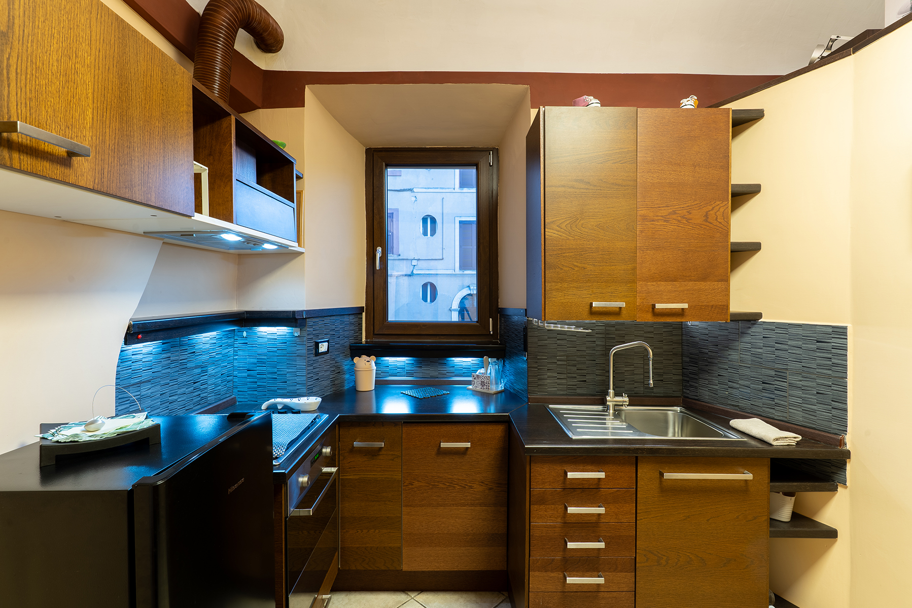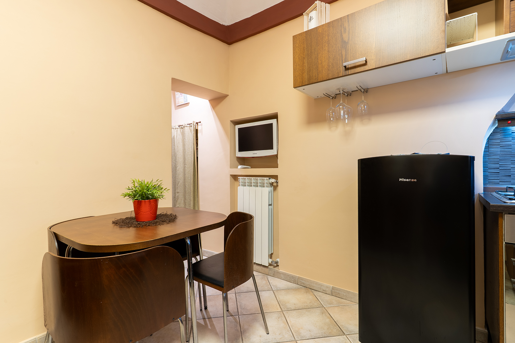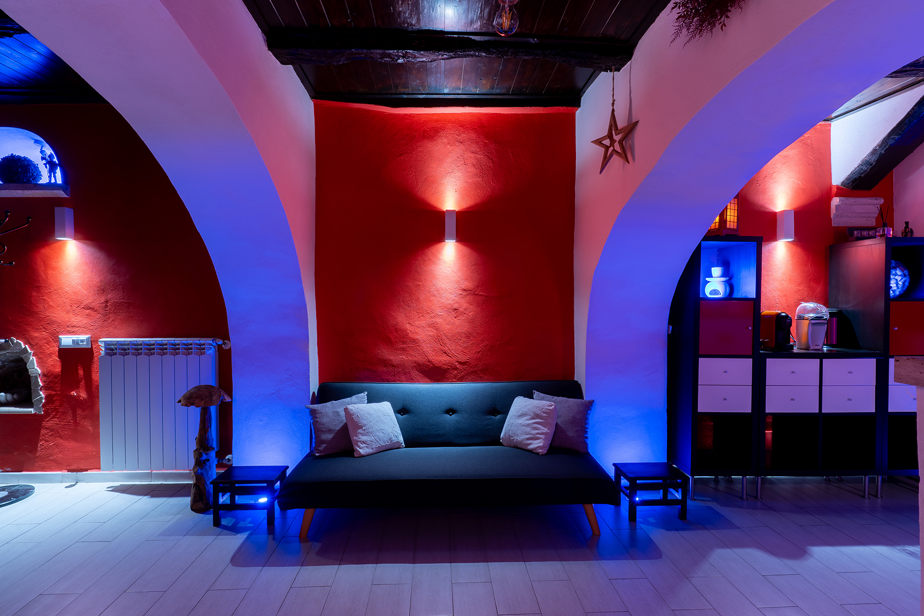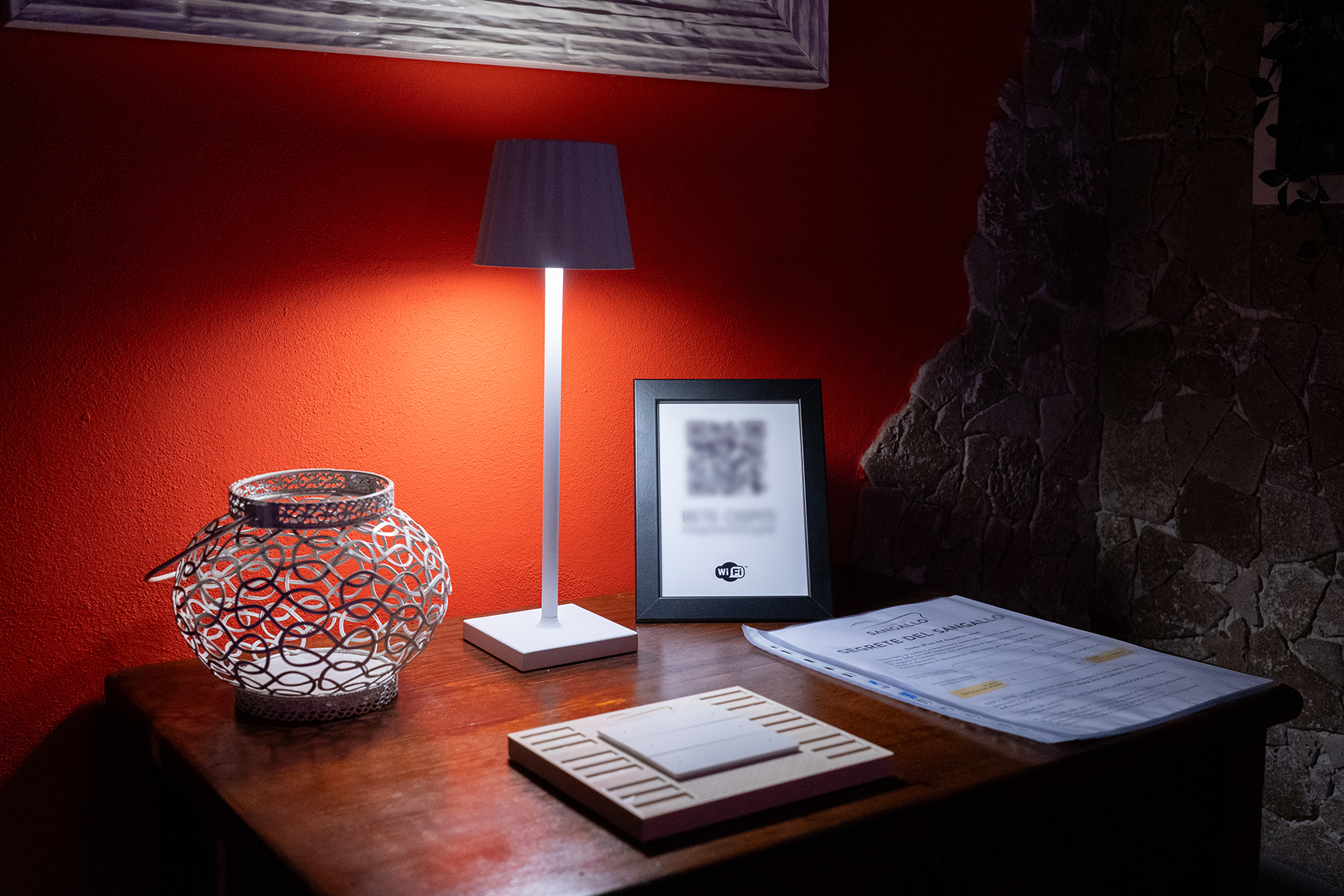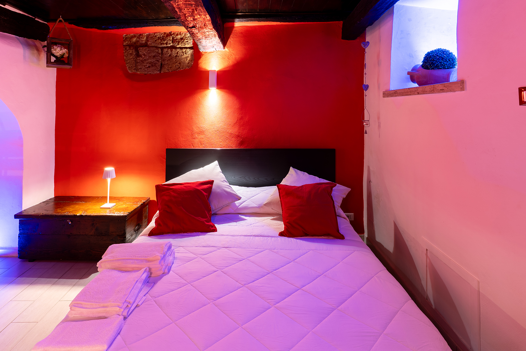 L’appartamento Le Segrete del Sangallo accoglie gli ospiti in un ambiente unico, caratterizzato da soffitti in legno, archi e pareti in tufo, arricchito da luci emozionali che creano atmosfere calde e rilassanti. Scendendo al piano interrato, una suggestiva cantina scolpita nel tufo invita a vivere un’esperienza sensoriale tra storia e gusto, ideale per momenti di degustazione e relax.